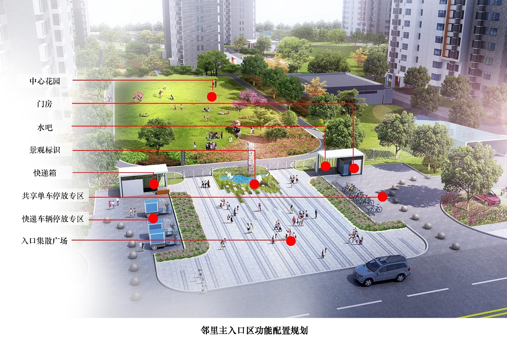 主入口實(shí)行人車(chē)分流組織,設(shè)置集散廣場(chǎng)、景觀標(biāo)識(shí)和中心花園。精細(xì)化布局門(mén)房、快遞箱、水吧、共享單車(chē)與快遞車(chē)輛停放專(zhuān)區(qū),形成功能強(qiáng)大的新型住區(qū)入口服務(wù)系統(tǒng)。