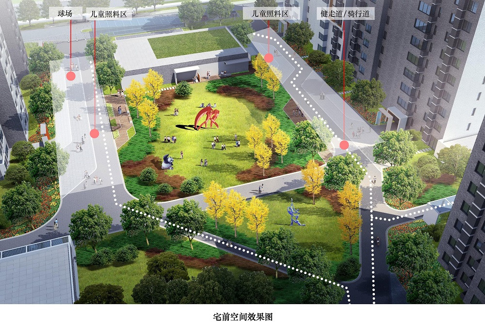 利用宅前消防登高場(chǎng)地規(guī)劃打球、健走、騎行和兒童照料等內(nèi)容,將宅前空間作為單元住戶的交往活力場(chǎng)所?;顒?dòng)場(chǎng)地外擴(kuò),結(jié)合綠化布置休閑座椅、花池廊架和文化藝術(shù)裝置,合理布局自行車(chē)棚、信報(bào)箱、垃圾收集箱和配電室等項(xiàng)設(shè)施。單元樓門(mén)設(shè)置入口標(biāo)識(shí)和門(mén)禁,居民活動(dòng)也能對(duì)樓宇安全發(fā)揮良好的監(jiān)控作用。